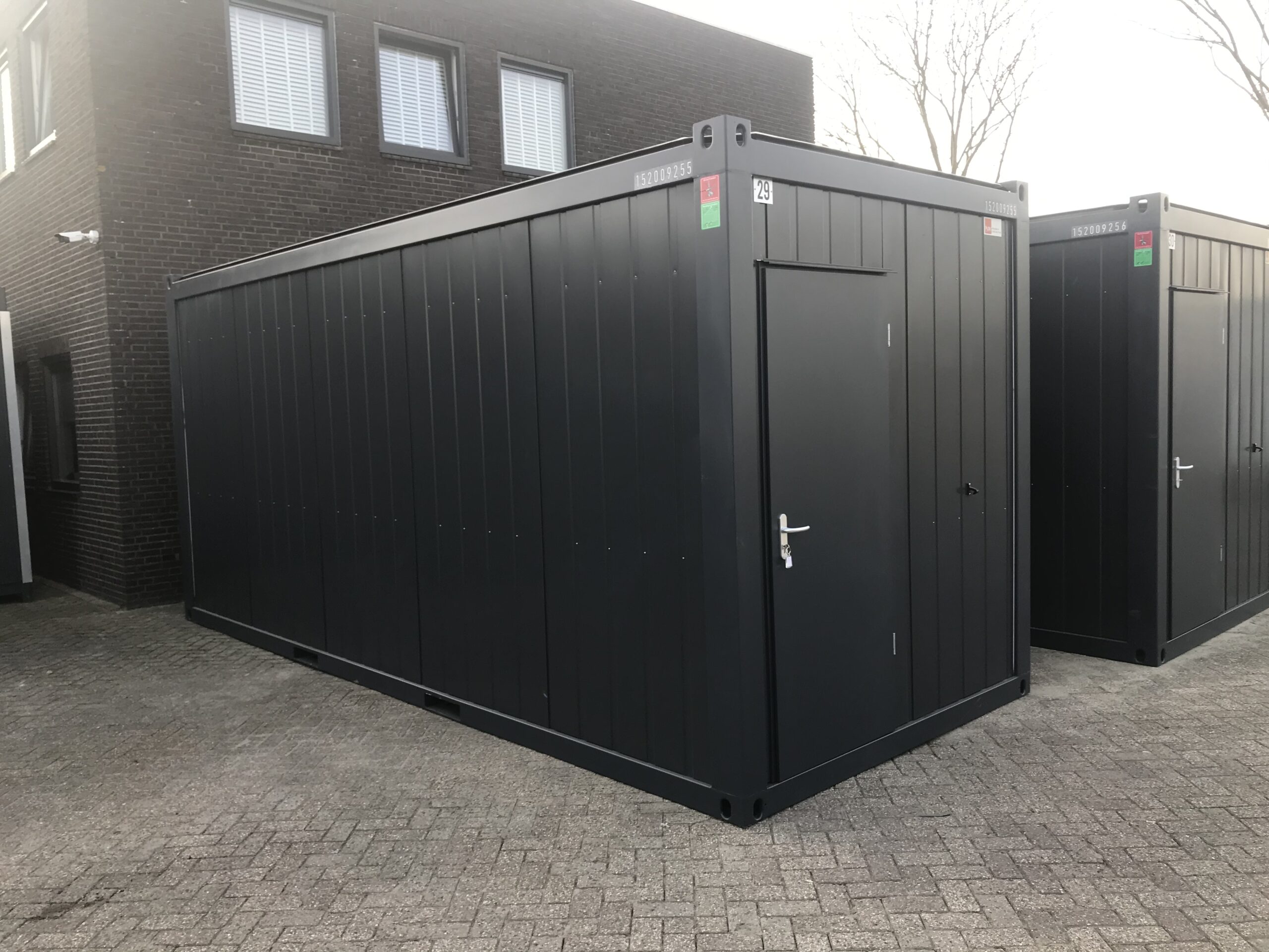 Unit antracietgrijs (RAL 7016), afmeting ca. 6x2,5x3 mtr. met deur aan korte zijde & 2 ramen